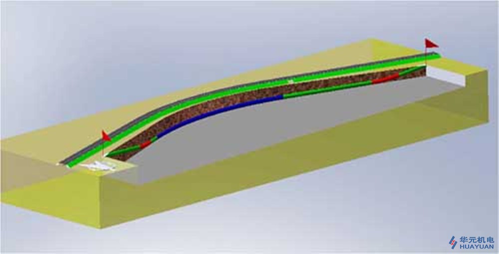 為同時避過高速路基和地板廠建筑地基,華元公司突破傳統(tǒng)穿越曲線只有豎直轉角或豎直轉角加一個水平轉角的模式,創(chuàng)造性地開創(chuàng)了帶有5個轉角的三維空間立體穿越曲線。