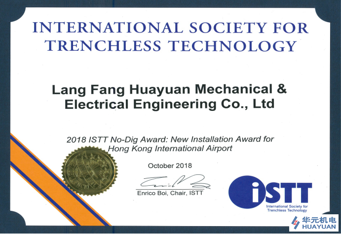 October 2018, Langfang Huayuan Mechanical & Electrical Engineering Co., Ltd. was awarded the 2018 ISTT No-Dig Award (New Installation Award for Hong Kong International Airport) by the International Society for Trenchless Technology (ISTT);
