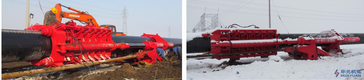 When long string of pipeline with large diameter, is pulled into the borehole in sand formation, the dragging resistance is usually strangely higher than the capability of the pulling rig, at this time, our pipeline thrusting device can be used at the opposite end of the pulling site to assist pushing it into the borehole.By now, Huayuan self-developed HY-500T pipeline thrusting devices have already been successfully used in the projects of Liao River HDD Crossing for Qinhuangdao-Shenyang Pipeline, and the Yellow River HDD Crossing for Boai-Zhengzhou-Xuedian Gas Pipeline.