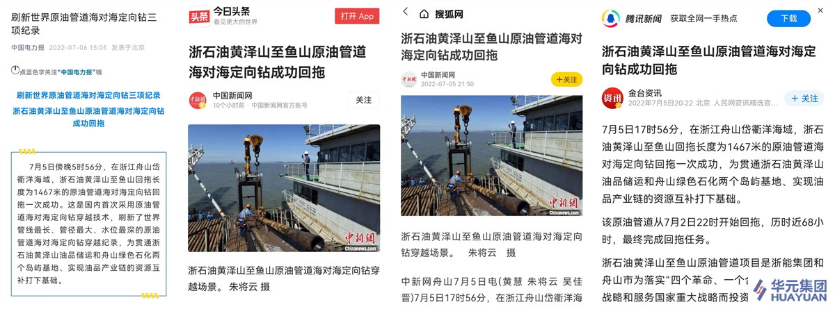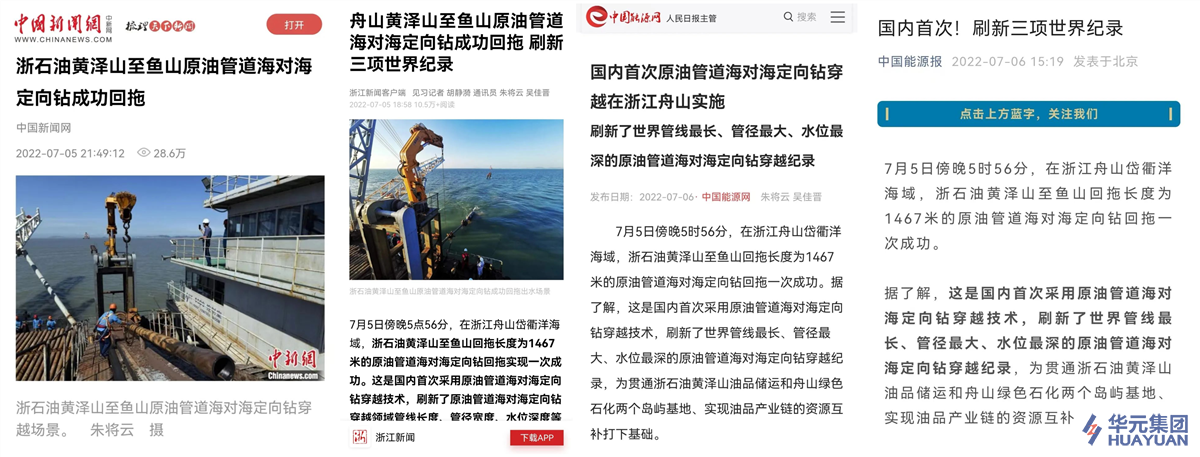 7月5日傍晚5點56分,在浙江舟山岱衢洋海域,浙石油黃澤山至魚山回拖長度為1467米的原油管道海對海定向鉆回拖實現(xiàn)一次成功。這是國內(nèi)首次采用原油管道海對海定向鉆穿越技術,刷新了原油管道海對海定向鉆穿越領域管線長度、管徑寬度、水位深度等三項世界紀錄。